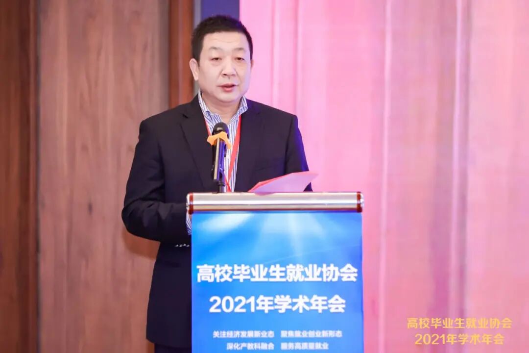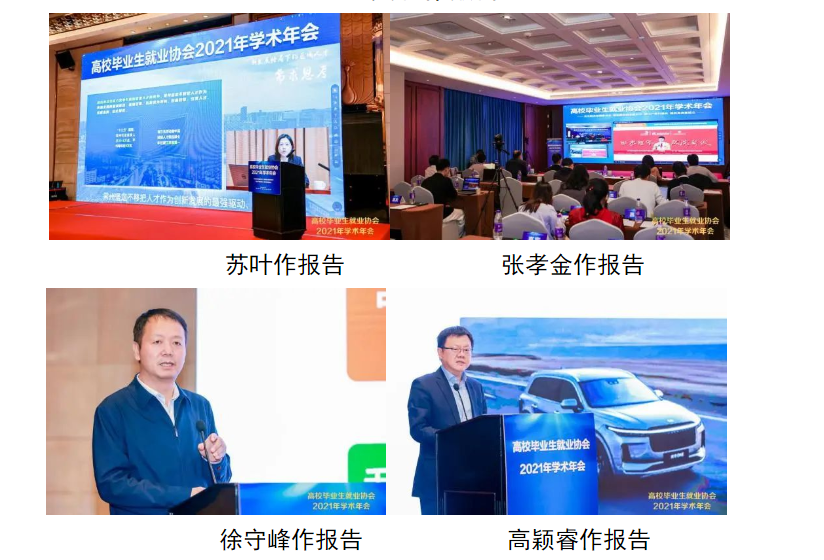 吕冰作了题为《践行以人民为中心的发展思想,促进高校毕业生高质量就业》的报告;文君作了题为《树立全周期人才培养质量观,以更高质量和更充分就业服务国家新发展》的报告;常州市人社局副局长苏叶同志作了题为《新发展格局下的区域人才需求思考——以常州市为例》的报告;江西环境工程职业学院副校长张孝金作了题为《走好产教深度融合之路,促进毕业生高质量就业的探索与实践》的报告;高校毕业生就业协会校企合作委员会秘书长徐守峰作了题为《打造大学生就业创业“高速路”“万企千校融合工程”的探索与实践》的报告;高校毕业生就业协会本科生就业工作委员会副理事长、大技狮创始人、盛拓传媒董事长高颖睿先生作了题为《新发展格局下企业人才需求与大学生终身成长引导》的报告。
