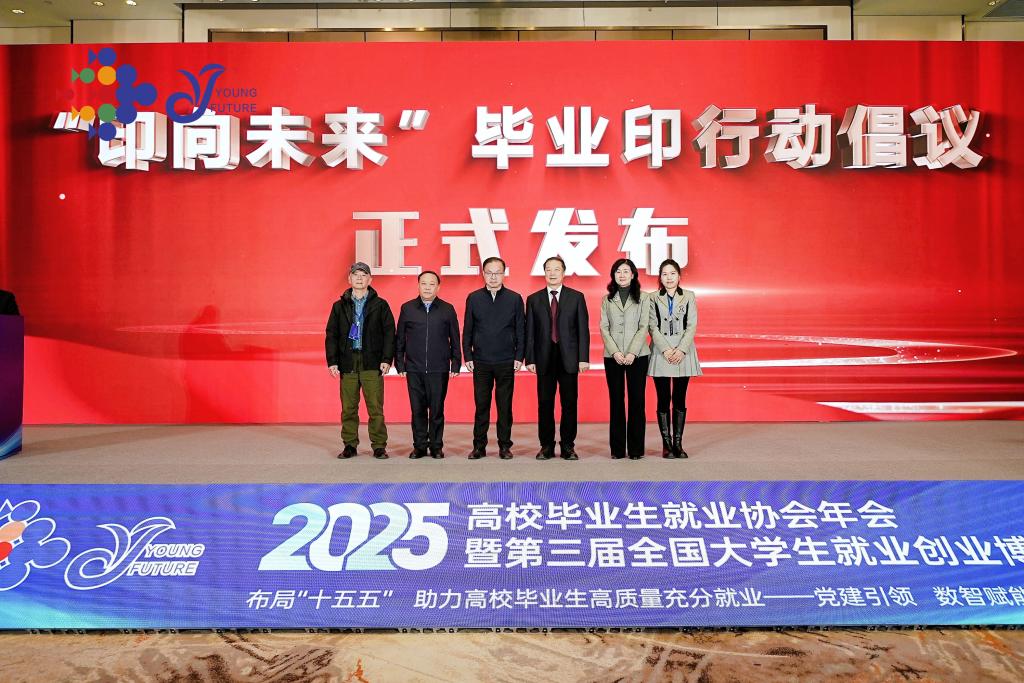 1月14-16日,2025年高校毕业生就业协会(以下简称协会)年会暨第三届全国大学生就业创业博览会在上海举办。会上,协会与中国职工文化体育协会、复旦大学、苏州工艺美术职业技术学院、成都艺术职业大学、浙江建设职业技术学院等单位联合发起了“印向未来”高校毕业印行动倡议。协会常务副会长、中央音乐大学原党委书记赵旻,中国民办教育协会党建专委会理事长、教育部思想政治工作司原一级巡视员俞亚东,北京歌华文化发展集团原党委书记、总经理李丹阳,成都艺术职业大学副校长甘庭俭,复旦大学管理学院副院长孙一民,浙江建设职业技术学院辅导员、大众篆刻志愿者闫雅婷共同启动了发布仪式,李丹阳宣读了“印向未来”毕业印行动倡议书。一起来看——