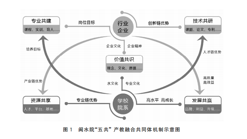 2016年以来,福建水利电力职业技术学院(以下简称“闽水院”)试点实施“二元制”改革,以学校人才培养质量提升和企业对员工综合素质提升的迫切需求为契合点,以“二元主体、二元身份、二元教学、二元管理、二元评价、二元证书、二元学制”为协同育人模式,遵循“相互理解、相互尊重、相互信任、互利共赢”的原则,构建“价值共识、专业共建、技术共研、资源共享、发展共赢”机制的产教融合共同体(图1),全面促进“产业链、专业链、人才链、创新链”融通,大力创新产教融合“二元制”,取得良好成效。